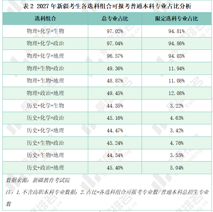 2027年新疆普通本科招生物理类选科中“物理+化学”组合的报考优势明显,可报考约96%以上的普通本科专业。仅选物理不选化学的考生,其可报考的限定专业占比仅11%左右,远低于物化组合考生94%的专业覆盖率。