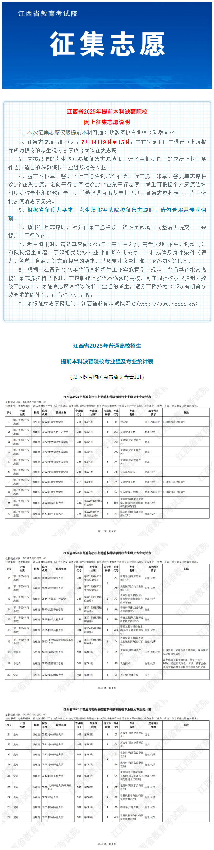 7月14日9时至15时,江西省2025年提前本科缺额院校网上征集志愿