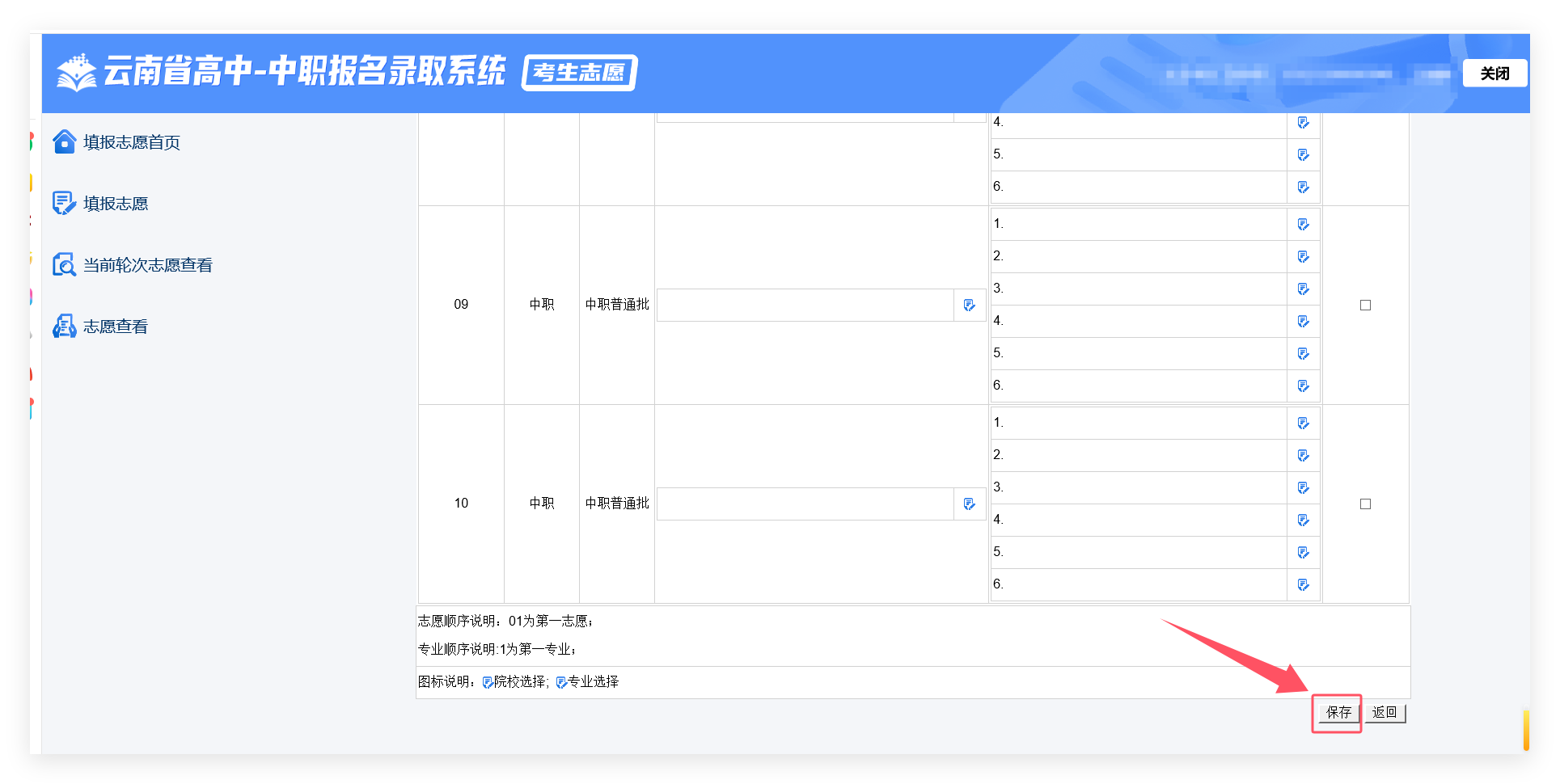 “所报专业”列选择考生有意愿就读的专业(注:考生最想就读的专业报在第一个志愿),专业选定完毕后划到页面最底端右下角点击【保存】,点击【当前轮次志愿查看】核对所报志愿信息。