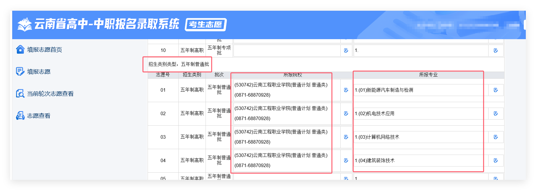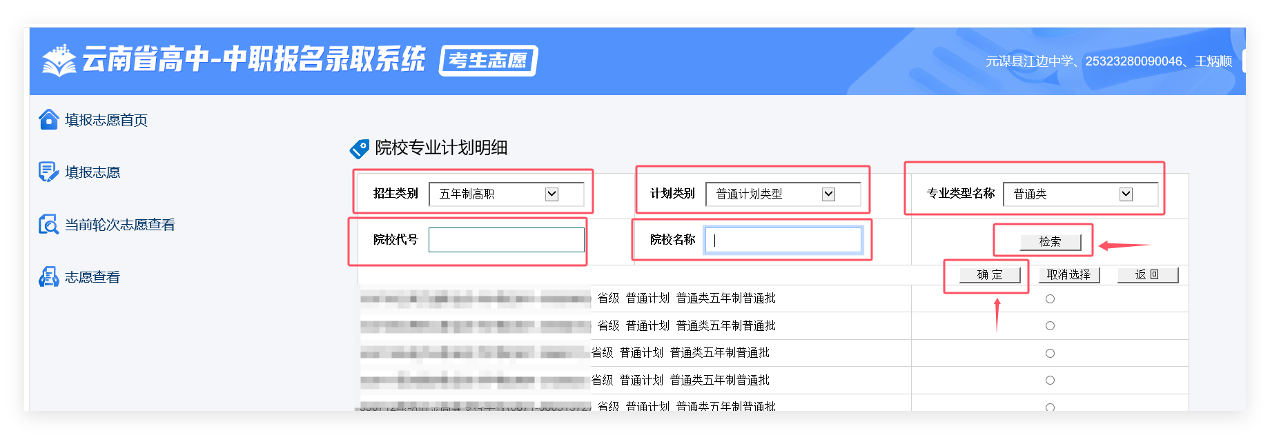 在志愿填报页面“志愿列表”中找到“招生类别类型:五年制普通批”,“所报院校”列输入云南工程职业学院志愿填报代码:530742,点击【检索】后再点击【确定】选定学校。
