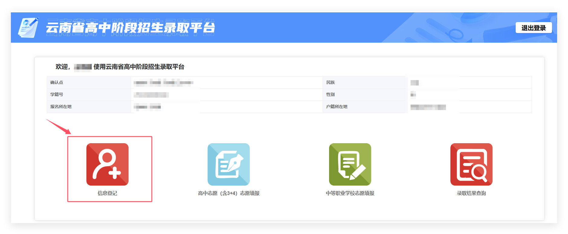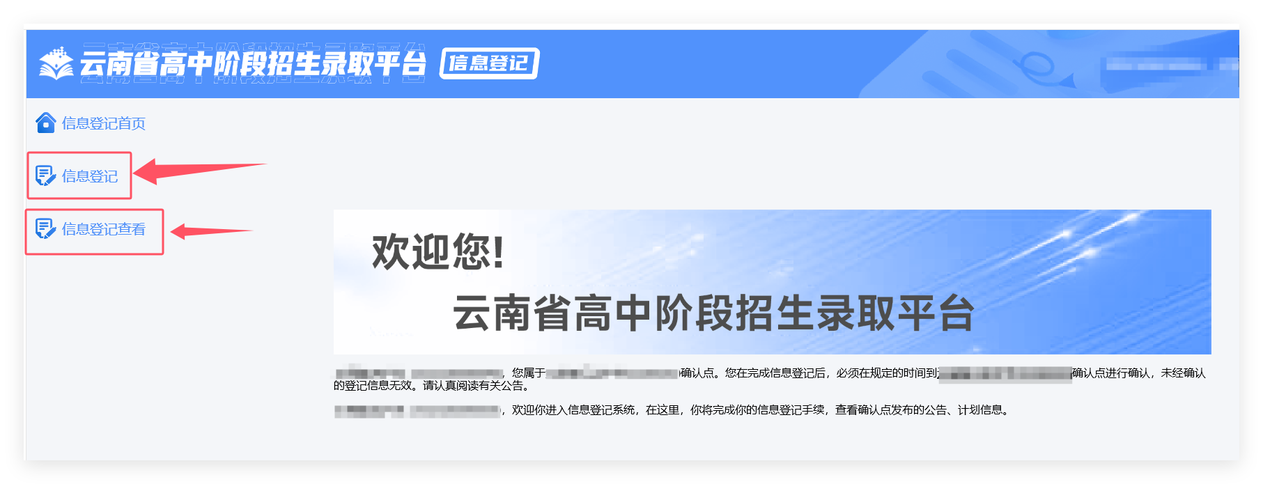 登录进“云南省高中阶段招生录取平台信息登记”首页,点击【信息登记】完成个人信息登记后,点击【信息登记查看】核对个人信息。