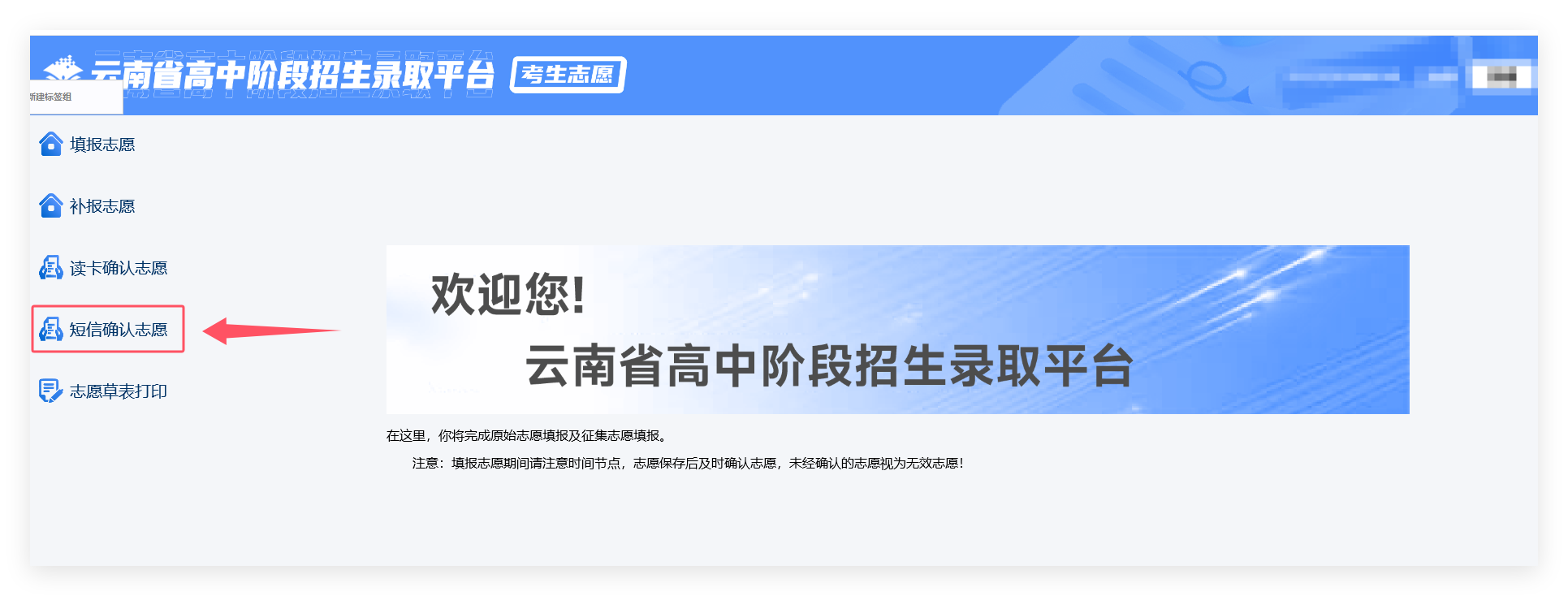点击【短信确认志愿】可以使用手机短信进行考生征集志愿确认,手机号为信息采集预留电话号码(该功能只在征集志愿期间开放,原始填报志愿需到中考报名点确认)。