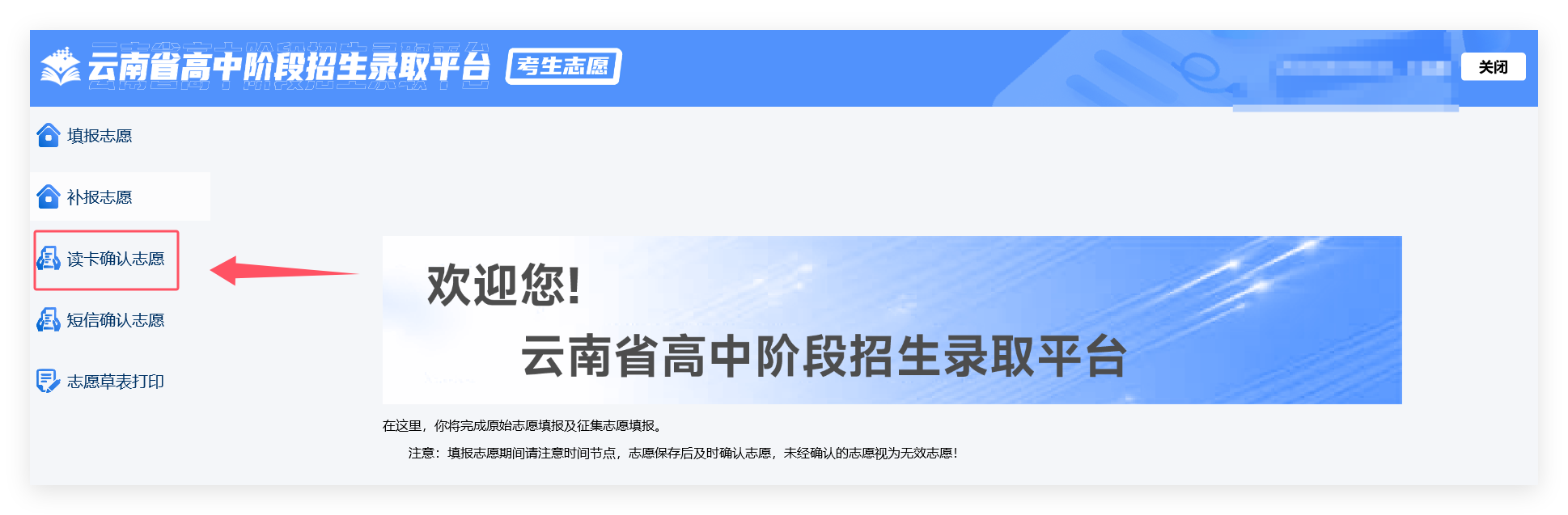 考生点击【读卡确认志愿】可以使用身份证原件进行征集志愿确认(该功能只在征集志愿期间开放,原始填报志愿需到中考报名点确认)。