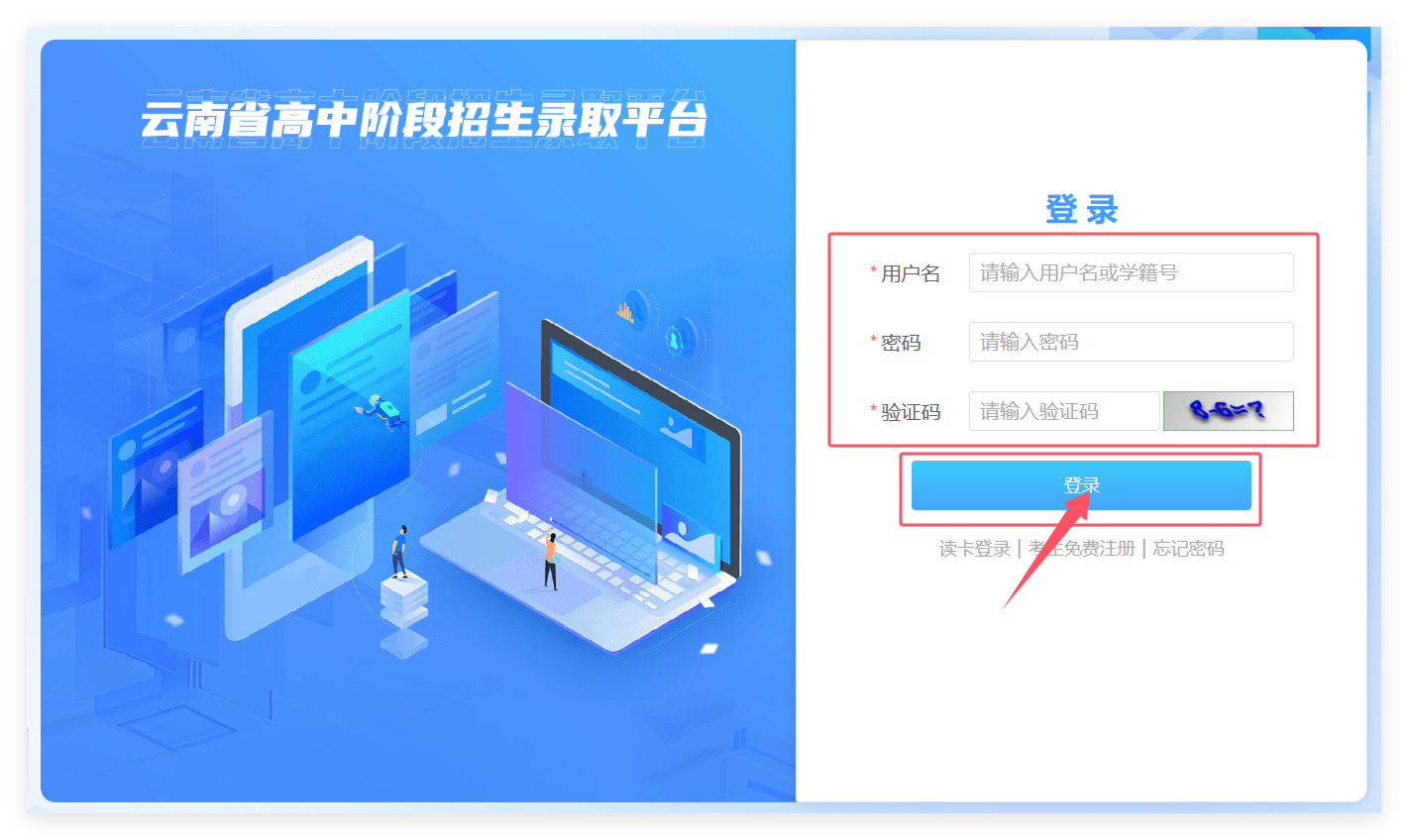 打开浏览器输入网址(https://gzzsgl.ynzs.cn/login),进入“云南省高中阶段招生录取平台”登录页面,输入“用户名(学籍号)+密码+ 验证码”组合,点击【登录】到“云南省高中阶段招生录取平台”。