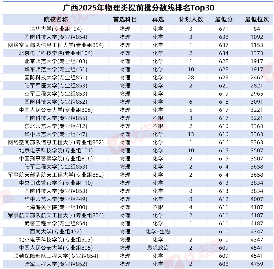 在2025年广西高考提前批投档线物理榜单前十中,军事类院校占据半壁江山,成为报考热点。国防科技大学、网络部队信息工程大学等军事类院校作为受到政策调整影响的典型,报考者相对去年来讲更稳定,都是对军事类专业有意向的学生,投档线因竞争群体改变而上升。
