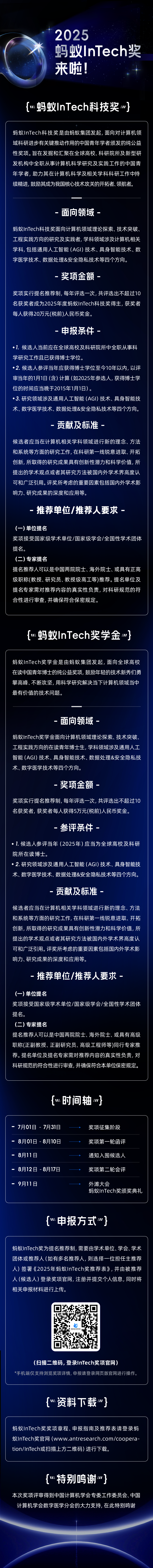 2、登录蚂蚁InTech奖官网(www.antresearch.com/cooperation/InTech或扫描下方长图中的二维码),即可详细了解奖项章程、申报指南及推荐表。