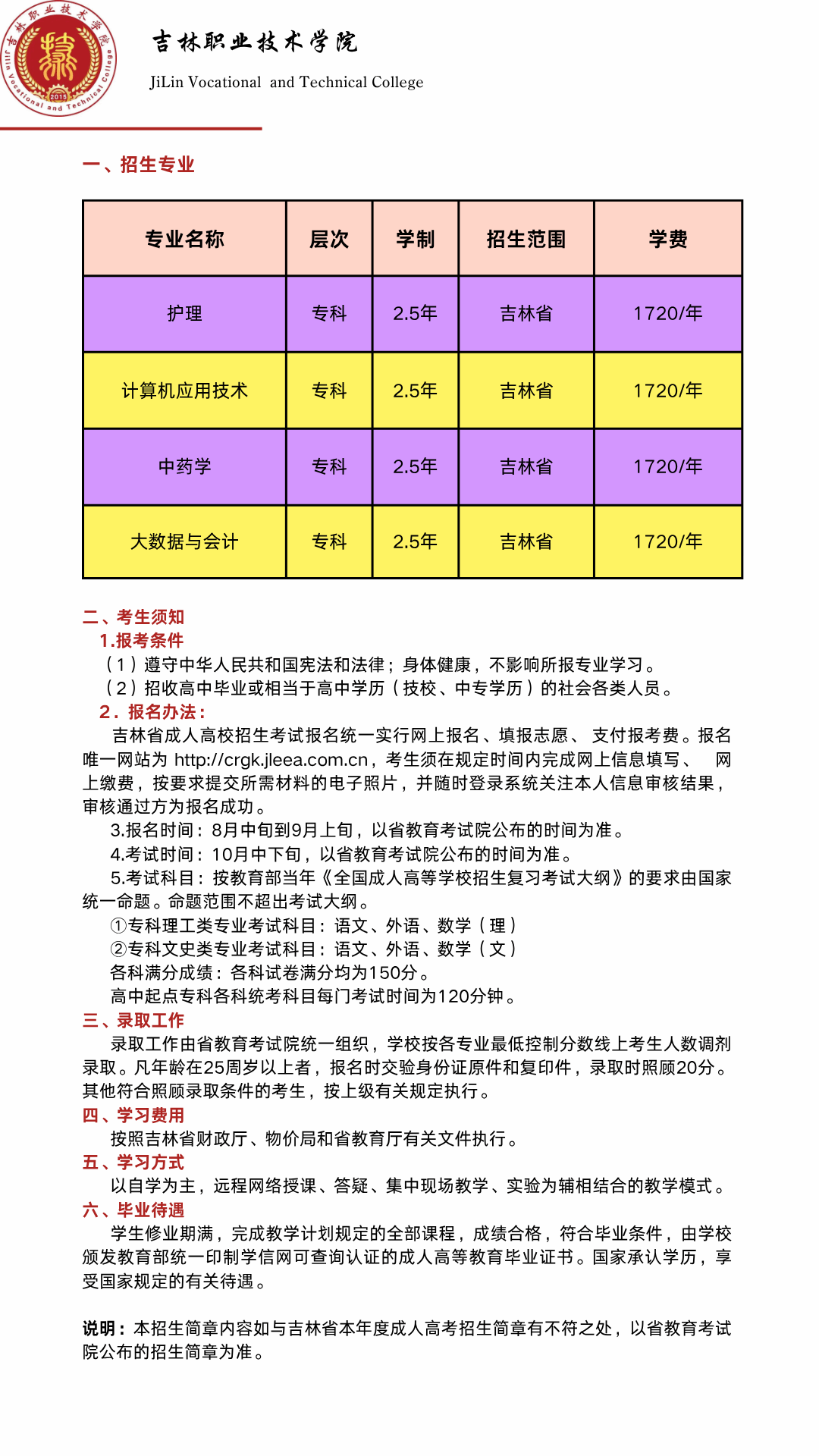 吉林职业技术学院高等学历继续教育2025年招生简章