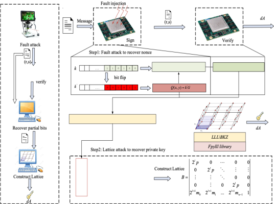 首先,团队发现了SM2-DSA在签名过程第四步前对随机数(nonce)值注入故障的安全漏洞。通过分析签名和验证过程中获取的正确和错误中间值,实现了对nonce值部分比特位的恢复。该方法突破了传统故障攻击需要精确时空控制的限制,可以显著提高攻击成功率。