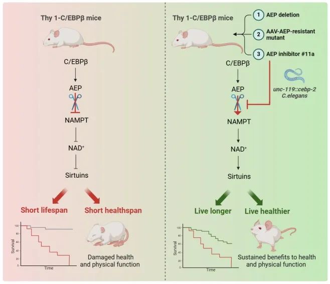 证实了C/EBPβ/AEP通路通过作用于NAMPT影响NAD+合成从而介导生理性衰老和寿命缩短表型,AEP基因的敲除、表达NAMPT剪切位点突变体或AEP的小分子抑制剂#11a则能有效延缓Thy 1-C/EBPβ转基因小鼠的早衰表型。