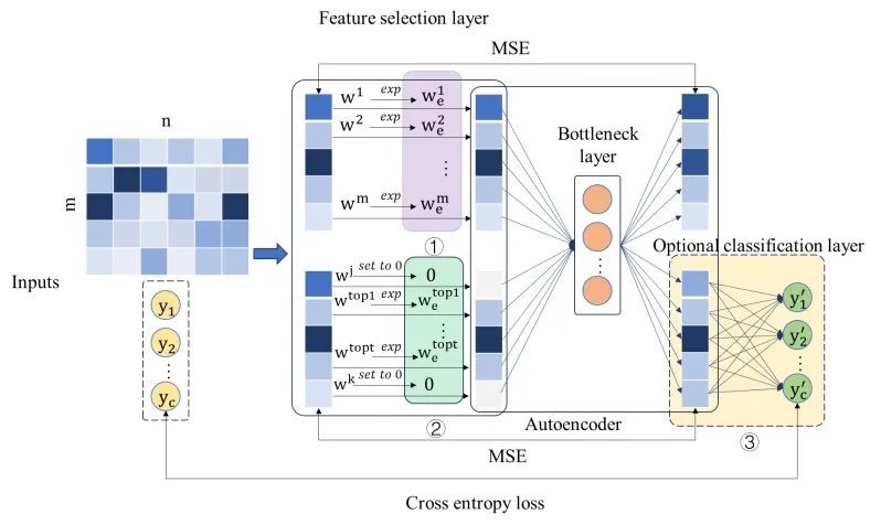 在高维数据分析领域,特征选择(Feature Selection)作为一项关键的预处理技术,其核心目标是从原始特征空间中甄别并提取出最具信息量或对特定下游任务(如分类、回归或聚类)性能贡献最为显著的特征子集。这一过程对于降低模型复杂度、提升泛化能力、减少过拟合风险以及增强模型可解释性均具有至关重要的理论与实践意义。近年来,深度学习凭借其强大的非线性表征学习能力,在特征选择领域展现出显著的潜力并取得了一系列重要进展。然而它们在选择特征的稳定性、特征选择层感受野以及样本信息利用等方面仍面临挑战。特别地,现有的一些方法(如分形自编码器FAE)可能存在选择特征数量少于预期、子网络感受野较小以及未能有效利用监督信息等问题。为此,本研究提出了一种基于增强型分形自编码器的高鲁棒性特征选择方法(Robust Fractal Autoencoder, RFAE),如图1所示,通过引入权重指数化、动态权重窗口和可选的分类模块三大关键改进,有效提升了特征选择的稳定性和适应性。