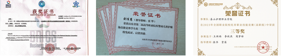 参加第一届全国职业院校托育职业技能竞赛、一带一路暨金砖国家技能发展与技术创新大赛婴幼儿照护职业技能赛项区域选拔赛,获得二等奖2项、三等奖2项。荣获山东省婴幼儿照护服务技能竞赛二等奖1项,三等奖3项。培养潍坊市技术能手1名、泰安市技能新星1名。