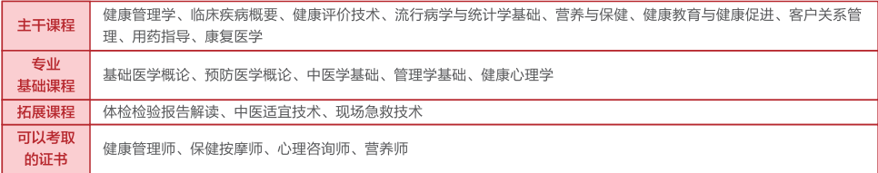 健康管理专业属于医药卫生大类健康管理与促进类,学制三年,旨在培养能够践行社会主义核心价值观,传承技能文明,德智体美劳全面发展,具有一定的科学文化水平,良好的人文素养、科学素养、数字素养、职业道德、创新意识,爱岗敬业的职业精神和救死扶伤精神,较强的就业创业能力和可持续发展的能力,秉承预防为主、健康为中心的理念,掌握本专业知识和技术技能,具备职业综合素质和行动能力,面向卫生、社会工作和居民服务等行业的健康管理师、公共营养师、社群健康助理员等职业,能从事健康信息的收集和管理、健康风险评估、健康教育与培训、健康咨询与服务、健康指导与随访、智慧健康项目管理等工作的高技能人才。