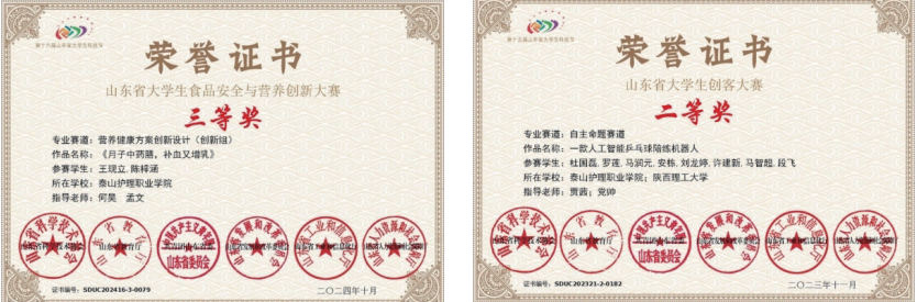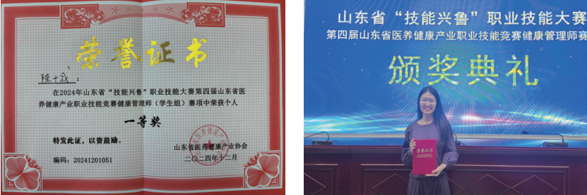2021年以来,健康管理专业学生参加山东省职业院校技能大赛,获二等奖1项;师生参加“技能兴鲁”山东省职业技能大赛健康管理师赛项,获一等奖第1名3项、获二等奖9项、三等奖9项;参加其他行业赛和山东省大学生科技节各赛项,获一等奖2项、二等奖2项、三等奖10余项。
