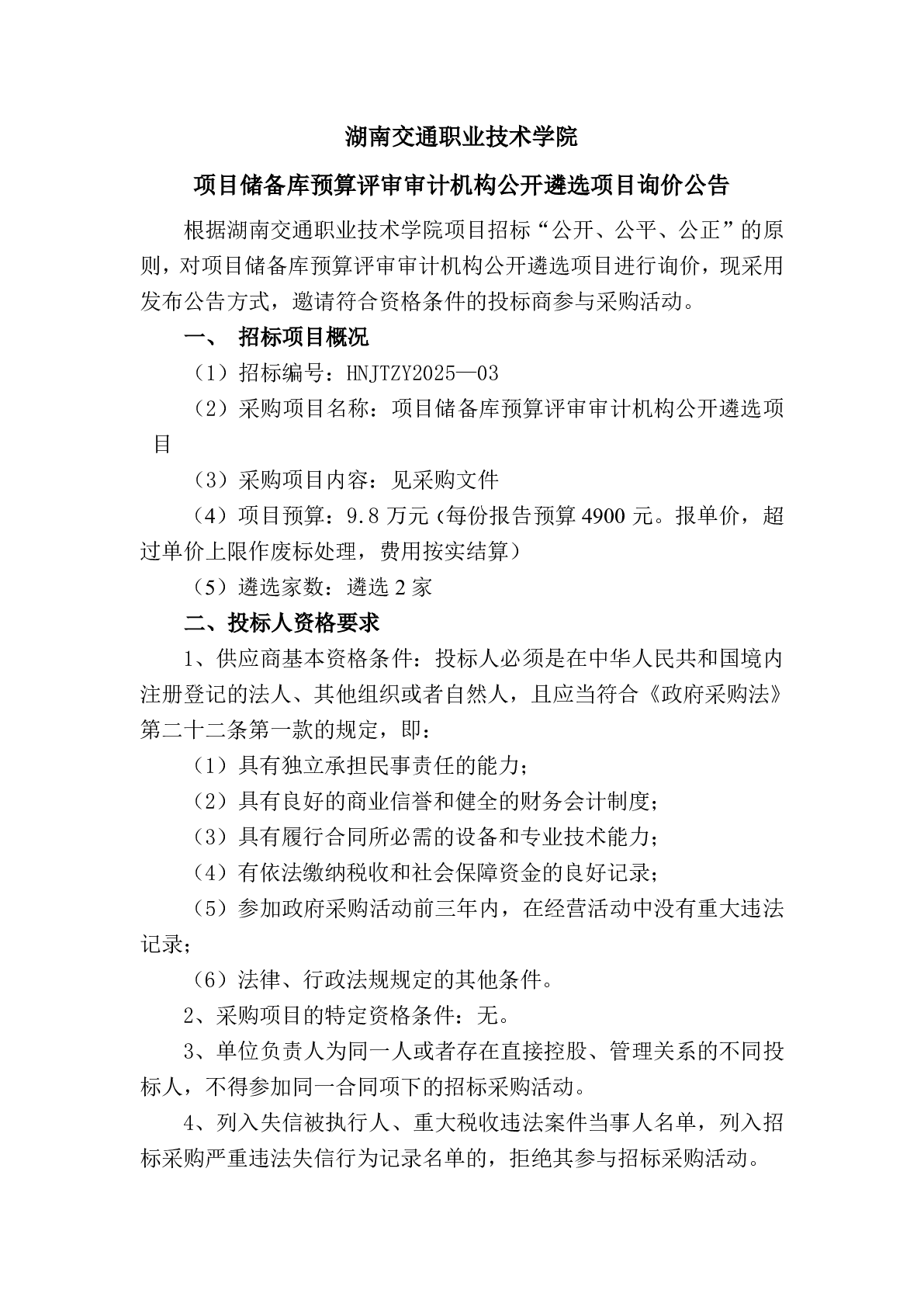 湖南交通职业技术学院 项目储备库预算评审审计机构公开遴选项目询价公告