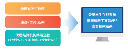 1、除了将还款资金存入合同约定的代理结算机构指定账户等待年度扣款以外,借款学生还可以通过代理结算机构APP、云闪付APP、助学贷款专用POS机等途径进行主动还款操作。