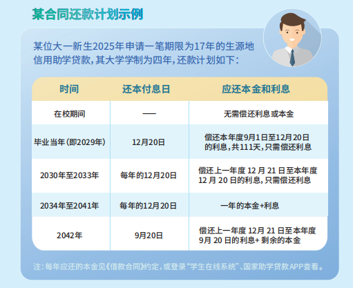 学生在读期间利息全部由财政补贴。毕业后继续攻读学位的借款学生,应在毕业当年的7月31日前向县级学生资助管理部门提出申请并提供书面证明,审核通过后,可继续享受贴息;不再继续攻读学位的,自毕业当年起自付利息,可享受5年的还本宽限期,期间只需偿还利息,暂缓偿还本金,如毕业后剩余贷款期限小于5年,则按《借款合同》约定的还款计划还款。