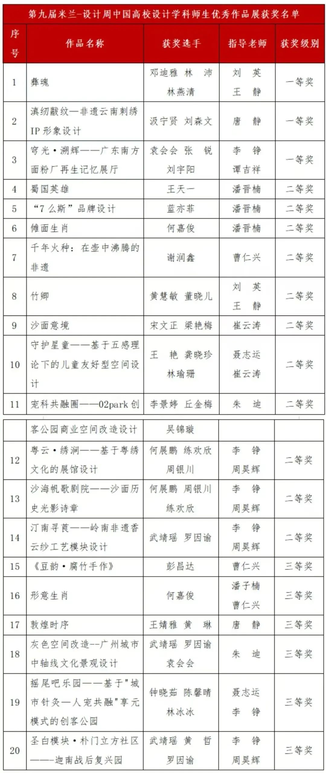 近日,第九届米兰设计周-中国高校设计学科师生优秀作品展(广东赛区) 评审结果揭晓。广演艺术设计学院师生凭借扎实的专业功底、良好的创新思维和独特的艺术表现力,取得优异成绩,斩获省赛一等奖3项、二等奖11项、三等奖6项,14件作品晋级全国总决赛。