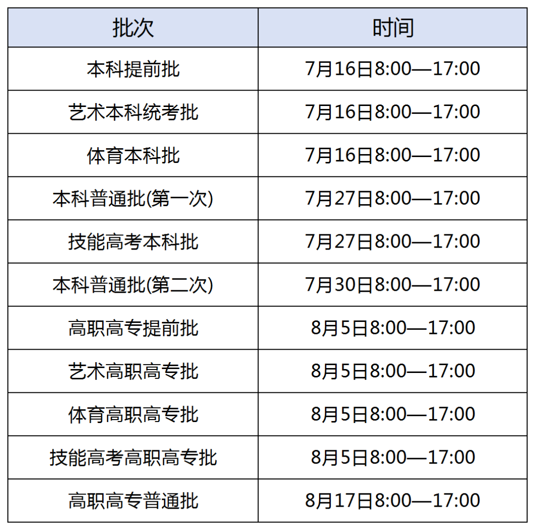 录取过程中,高校在投档后生源不足未完成的招生计划、投档后因少数考生不符合录取条件退档而未完成的计划、平行志愿投档后新增的招生计划面向全体考生重新公开征集志愿。省教育厅招生办公室每次于征集志愿前一天通过湖北省教育厅“高校招生”专栏(http://jyt.hubei.gov.cn/bmdt/ztzl/gxzs)公布征集志愿院校专业组和计划数,考生在规定时间登录省教育厅招生办公室网上填报志愿系统填报征集志愿。各批次征集志愿时间如下:
