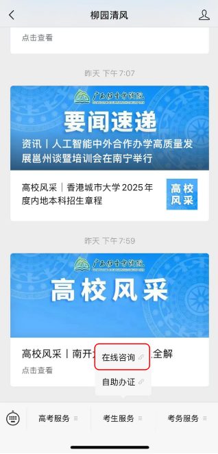 移动端入口:关注“柳园清风”微信公众号,点击底部菜单“考生服务-在线咨询”,即可便捷地进行在线咨询。