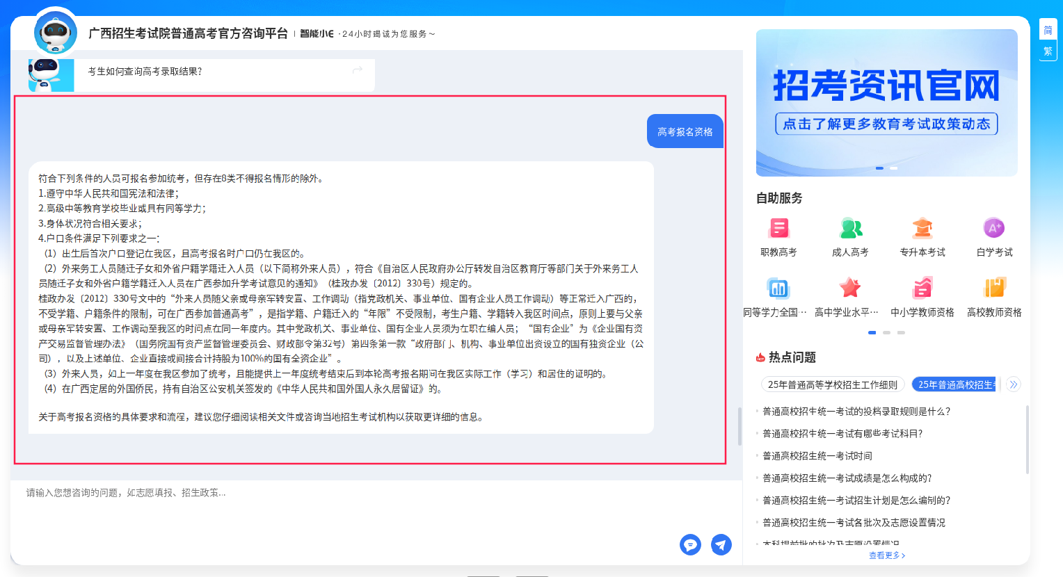 该系统具备强大的语义理解和信息处理能力,并且内置考试招生政策数据库,可实时调取广西考试招生报名政策、考试方式、录取规则、加分政策、批次设置等权威信息。