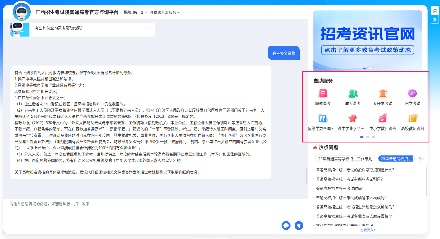 为方便考生和家长使用,自治区招生考试院的智能问答系统可从两个渠道进入。