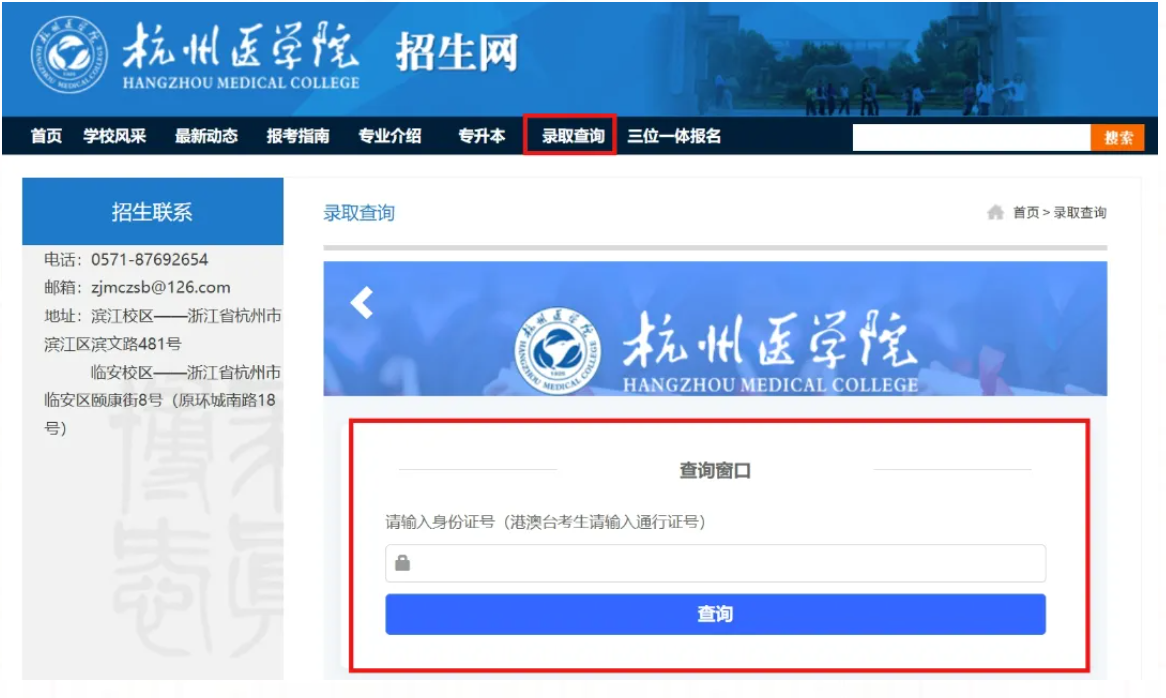 考生可登录“杭州医学院招生网”(zs.hmc.edu.cn),菜单栏选“录取查询”,输入身份证号,点击查询即可。最终录取以浙江省教育考试院查询为准。