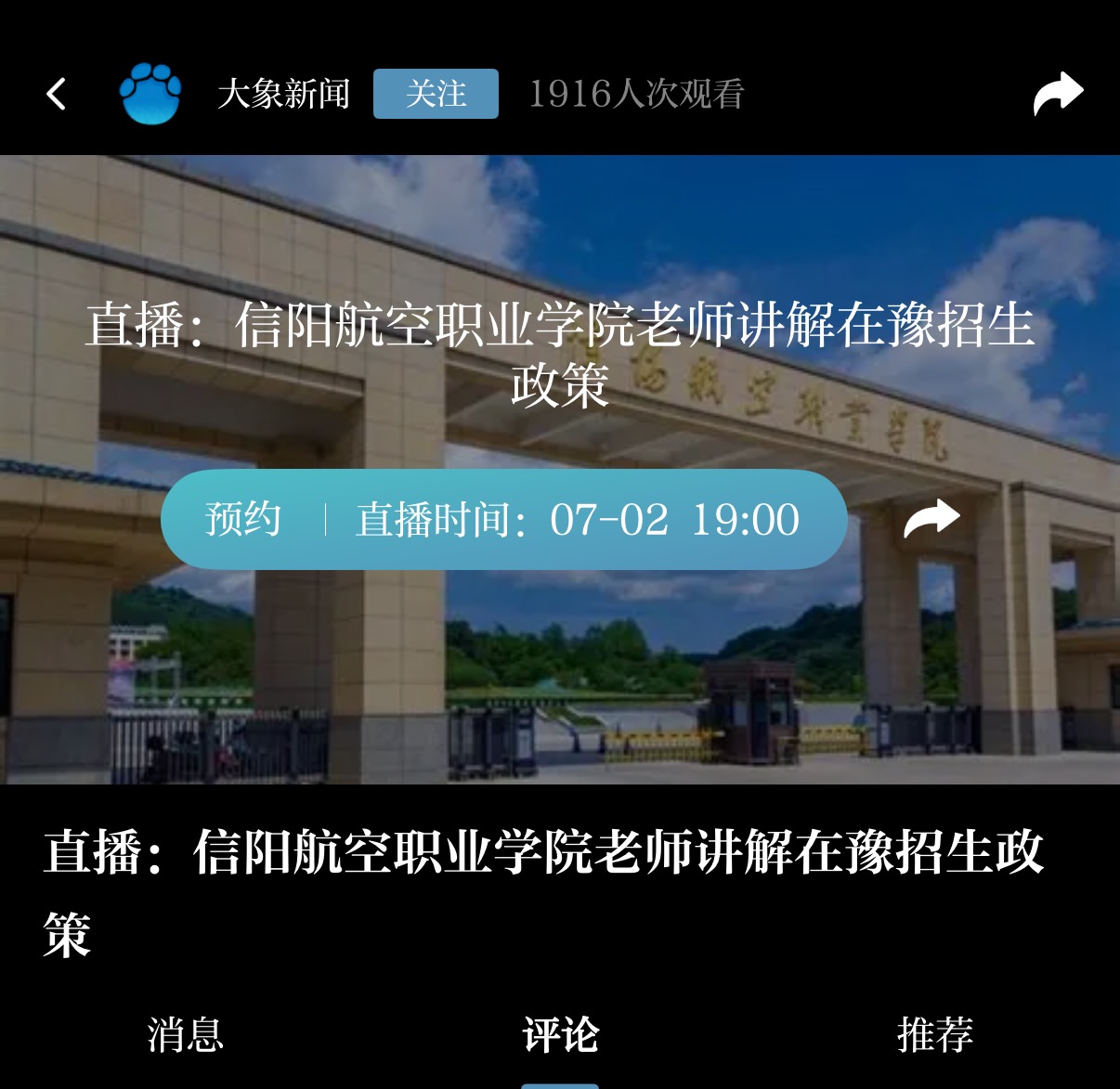 重磅消息!我校受邀参加河南广播电视台承办的河南省"高招面对面"视频直播活动,7月2日19:00全网发布!带你沉浸式了解信阳航空职业学院办学特色、专业优势和校园生活,快快锁定直播间!