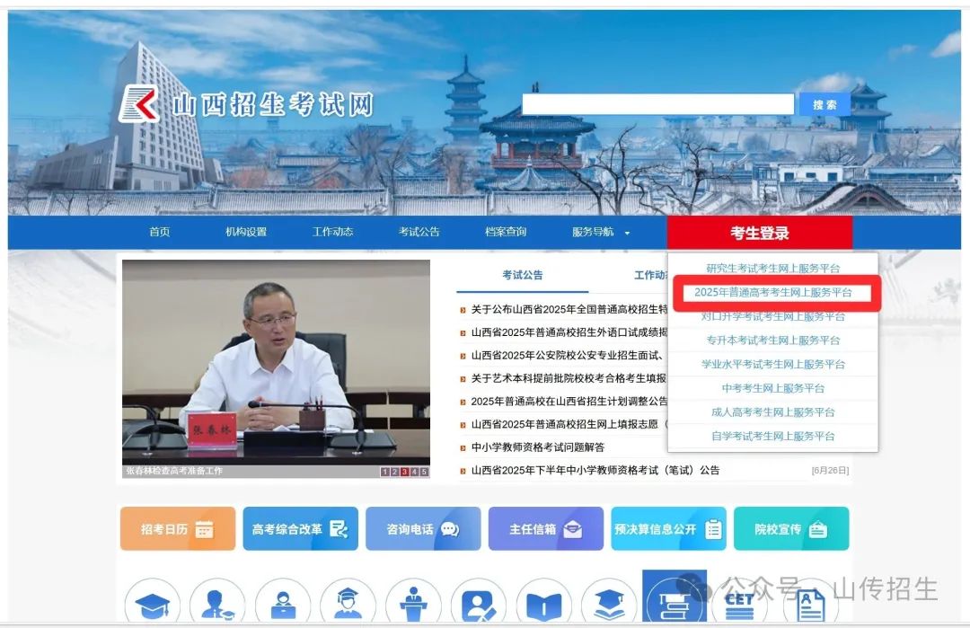 计算机浏览器地址栏中输入“山西招生考试网”(www.sxkszx.cn),在主页面的“考生登录”菜单中的“2025年普通高考考生网上服务平台”进入网上填报志愿登录窗口,输入考生号、登录密码、验证码,进入网上填报志愿系统。(如下图所示)