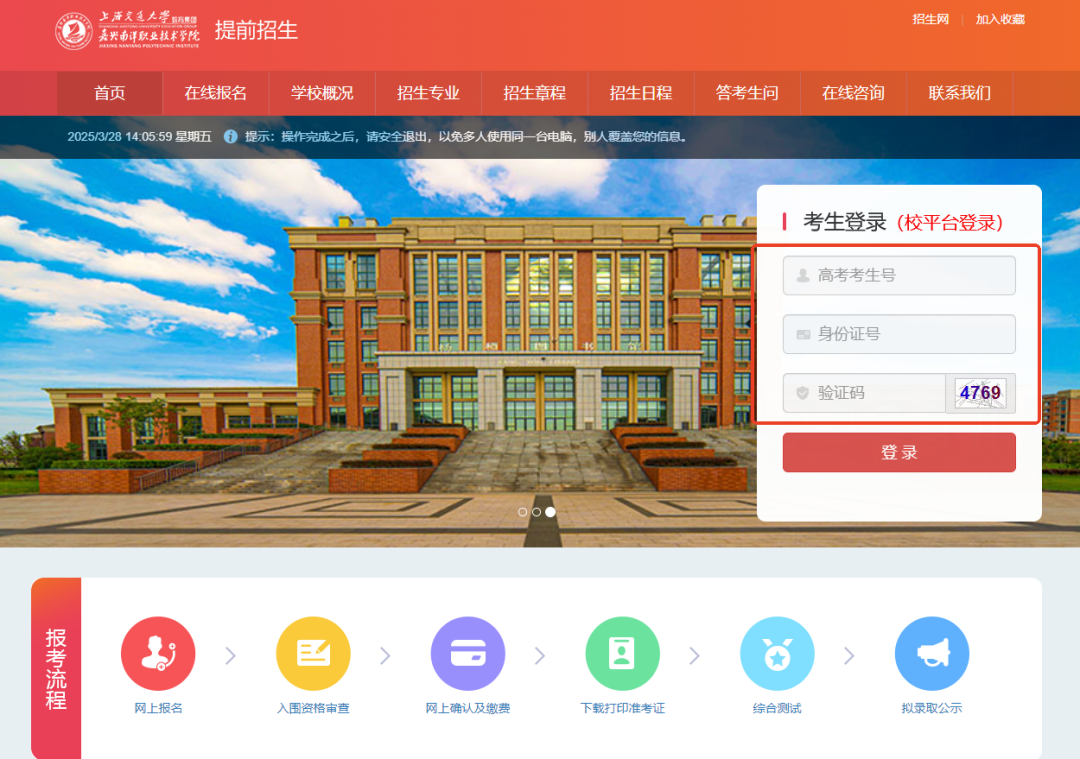 1.进入嘉兴南洋职业技术学院高职提前招生网https://tqzsny.eduw.cn/,输入高考考生号(2533开头的14位考生号)及身份证号