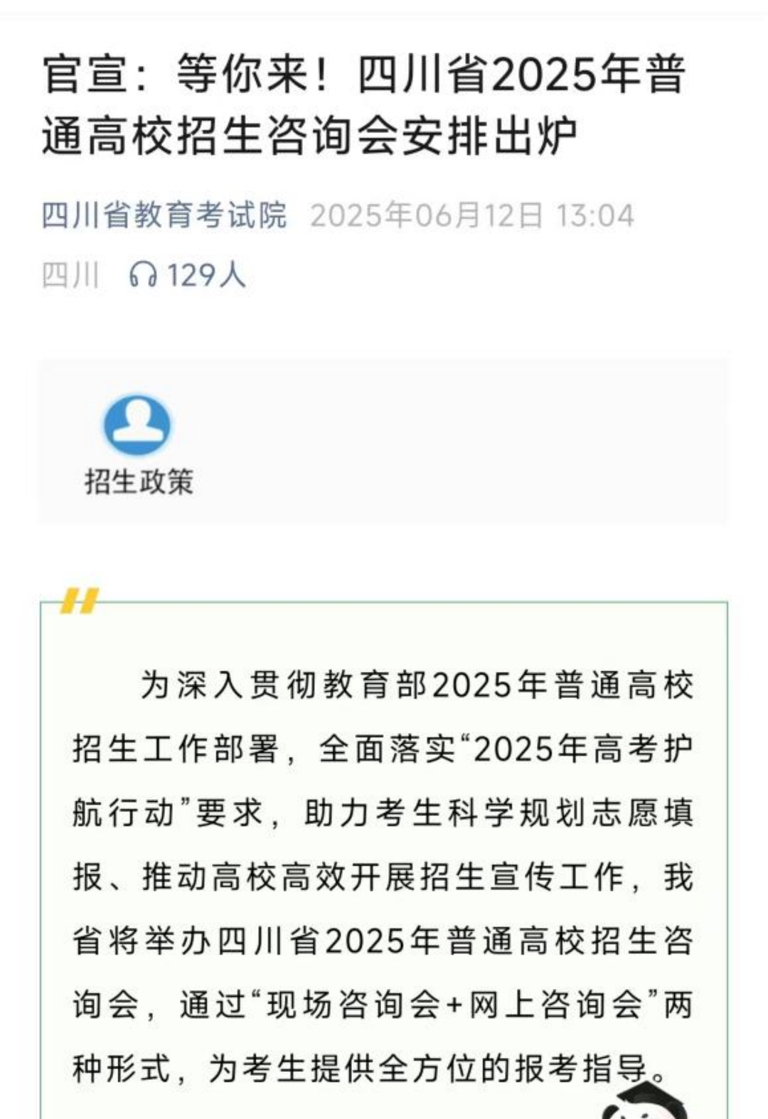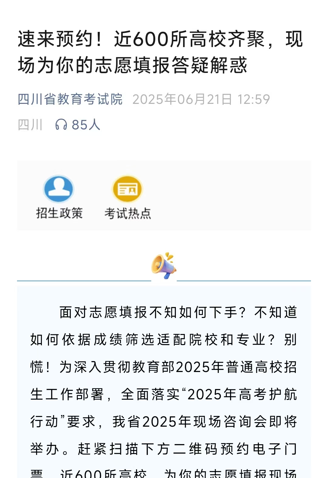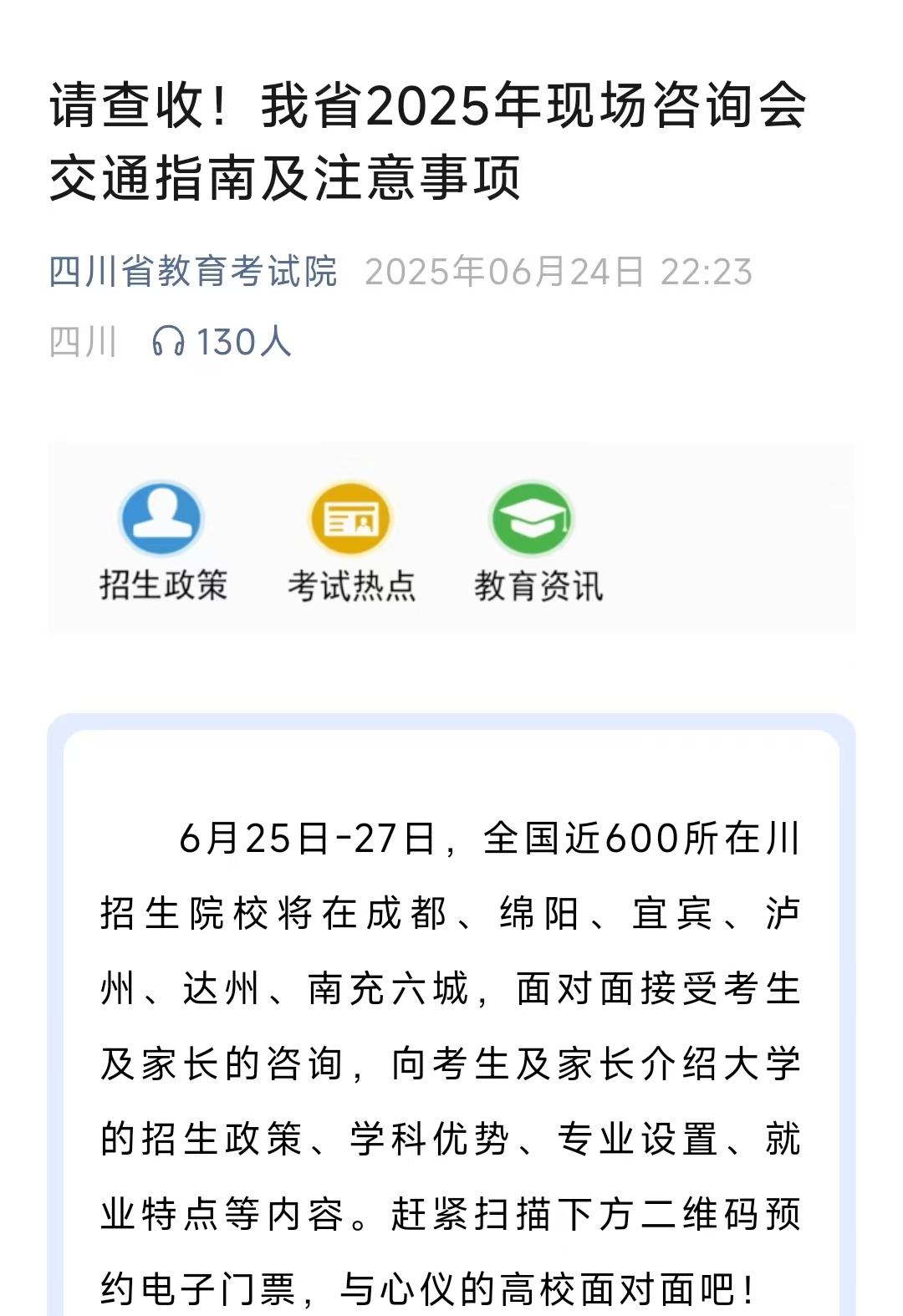6月25日至27日,正值我省高考成绩揭晓及准备志愿填报的重要时段,全国近600所高校组成招生最强阵容,分赴四川成都(西南石油大学<成都校区>)、绵阳(绵阳师范学院)、宜宾(宜宾市第一中学)、泸州(奥体中心,西南医科大学旁)、达州(达州市第一中学)、南充(西南石油大学<南充校区>)2025年普通高校招生现场咨询会现场,为考生及家长提供“零距离”升学规划咨询,精准赋能志愿决策。