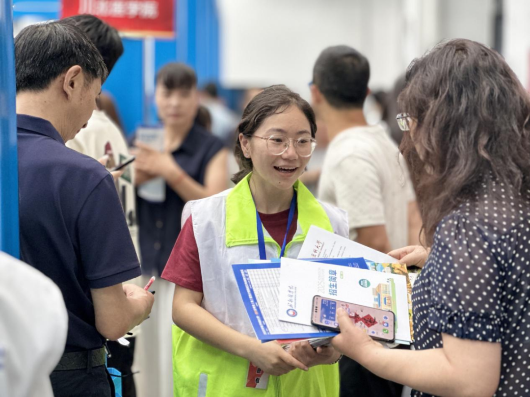 为优化参会体验,各地在场地规划上巧下功夫,指示牌不仅标注展位编号、高校名称,还通过精准定位图标与路线指引,让考生和家长能够“按图索骥”,快速抵达目标展位。同时,各咨询场地采用科学的动线规划,设置单向循环通道与独立进出口,有效避免人流对冲,保障现场秩序井然。此外,今年每个咨询现场都配备了志愿者。他们化身“人形导航”与“咨询管家”,不仅维护现场秩序、疏导人流,还耐心解答路线问询、协助整理资料,以专业细致的服务帮助考生家长高效获取信息,让整场活动在高效运转的同时,更添人文关怀。