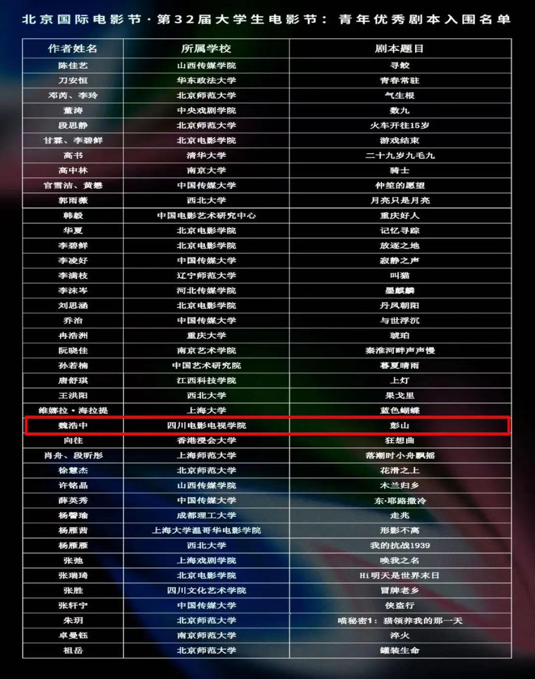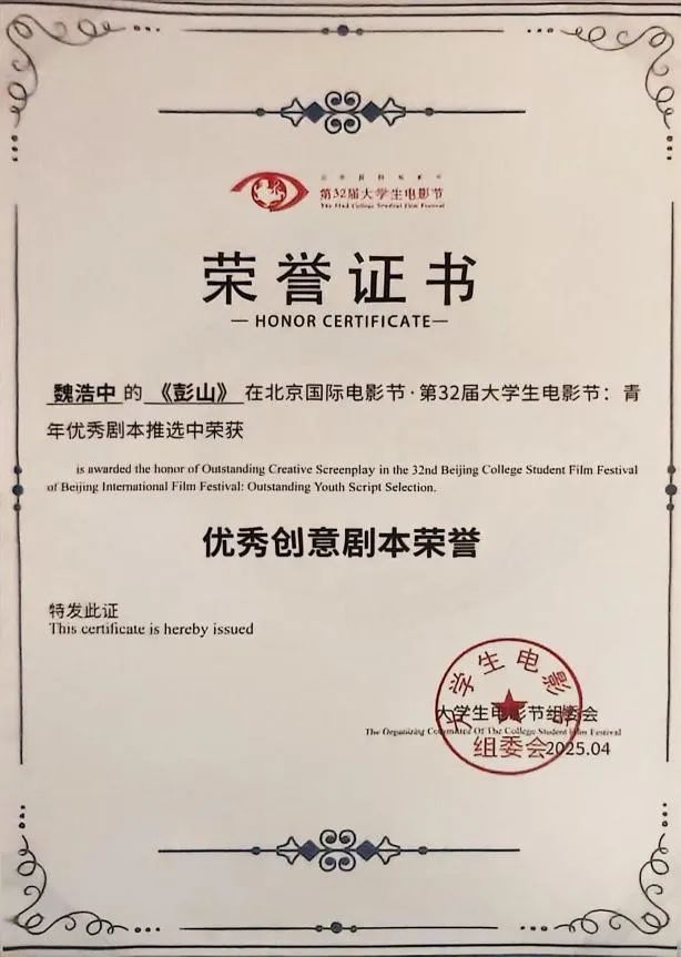 北京国际电影节·大学生电影节第32届青年优秀剧本推选结果新鲜出炉——戏文专业魏浩中同学的原创剧本《彭山》一路过关斩将,喜提“优秀创意剧本”荣誉!