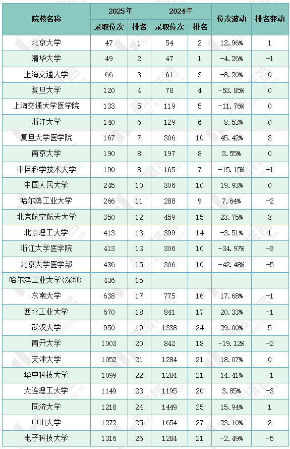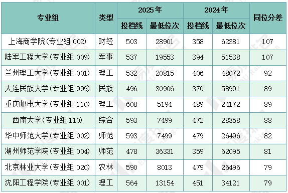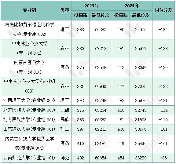 注:1.2024年同位分=2024年投档位次在2025年一分一段表中所对应的分数;2.仅含两年均招生的专业组