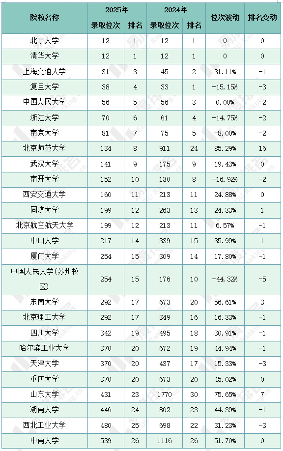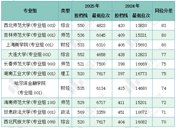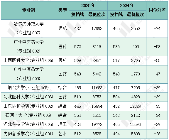 注:1.2024年同位分=2024年投档位次在2025年一分一段表中所对应的分数;2.仅含两年均招生的专业组