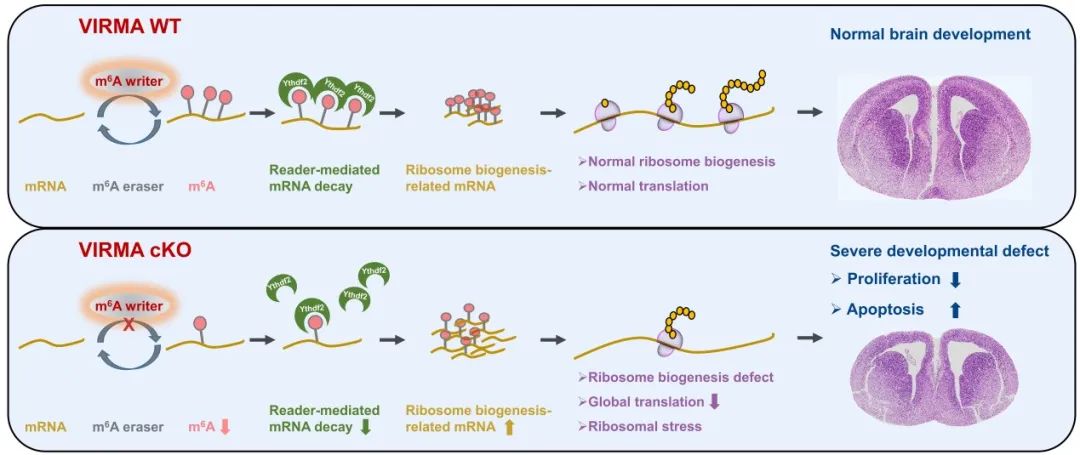 综上所述,该研究阐明了VIRMA-m6A-核糖体轴调控大脑发育的分子机制(图4),为理解小头畸形等神经发育疾病提供了新视角。此外,该研究还初步发现VIRMA在乳腺癌细胞(MCF7)和宫颈癌细胞(HeLa)中同样调控核糖体合成,提示其作为潜在治疗靶点的价值。