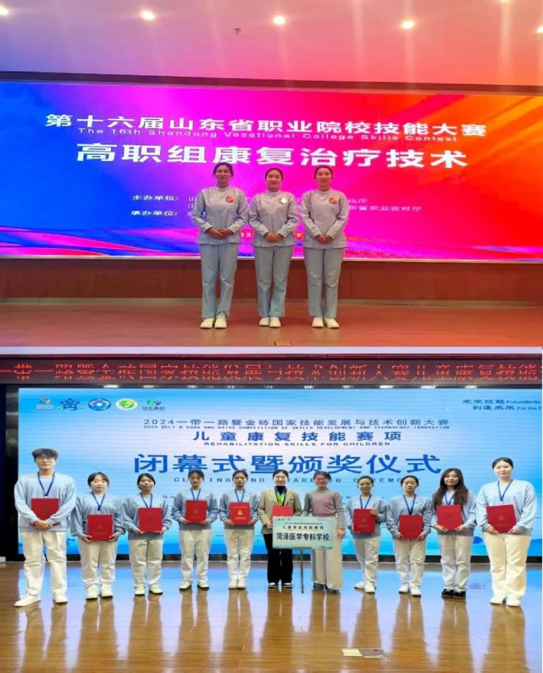 本专业学生获第二届山东省职业院校康复治疗技术专业学生技能大赛团体二等奖;第四届全国职业院校康复治疗类专业学生技能大赛团体二等奖;第三届山东省职业院校康复治疗技术专业学生技能大赛团体一等奖;第十六届山东省职业院校技能大赛(高职组)“康复治疗技术”赛项团体三等奖;“校园杯”儿童康复教育全国职业技能大赛中获三个一等奖、五个二等奖。