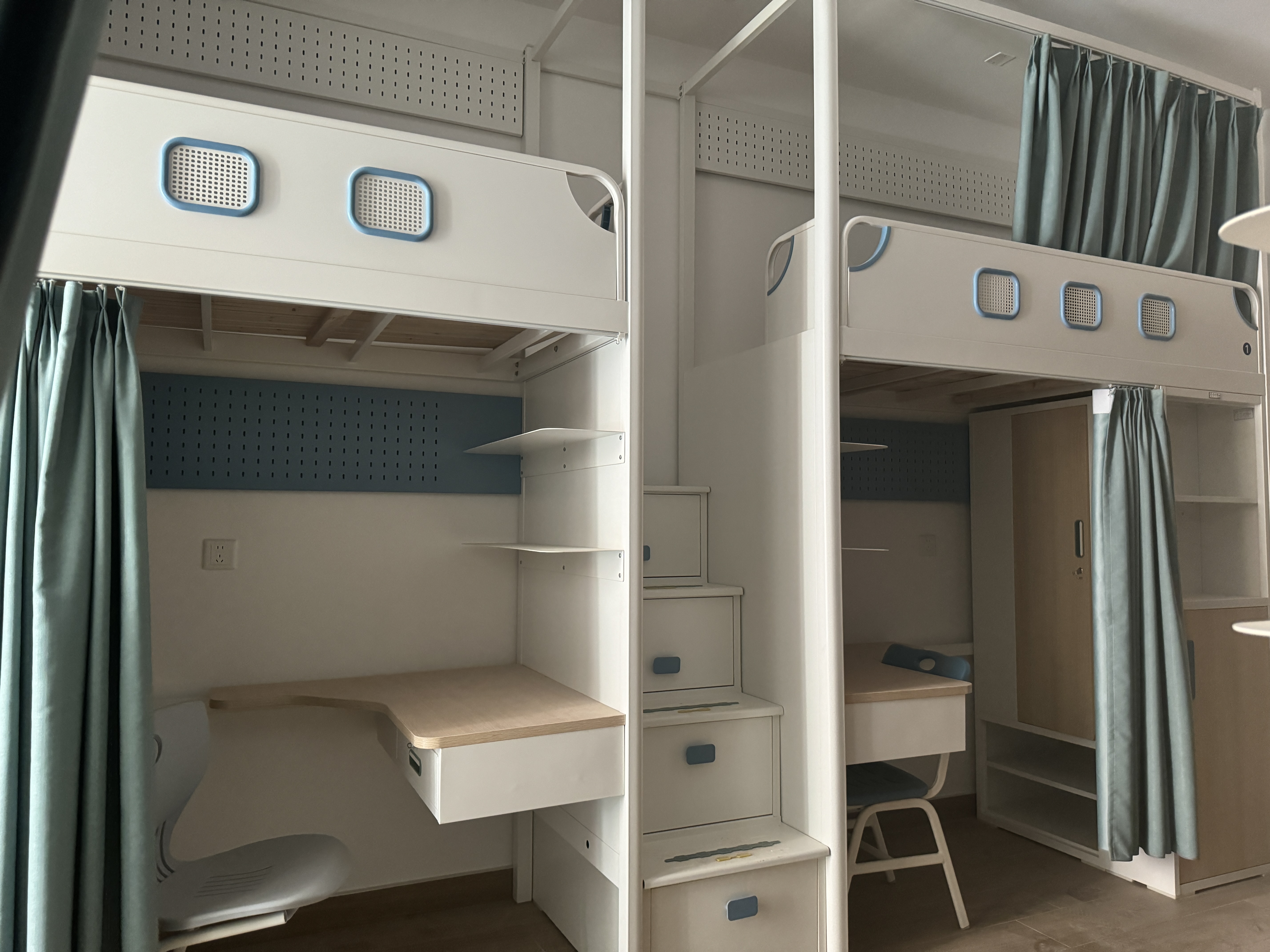 学生公寓全部按四人间配置,全省高校公寓独有的双卫生间、双大理石面盆和木纹地板、组合家具、空调、热水器,WIFI全覆盖、洗衣房、24小时开水、自动售货机、多部电梯。现代化高校公寓的高配服务,给学生带来独有的舒适、温馨、轻奢的体验。