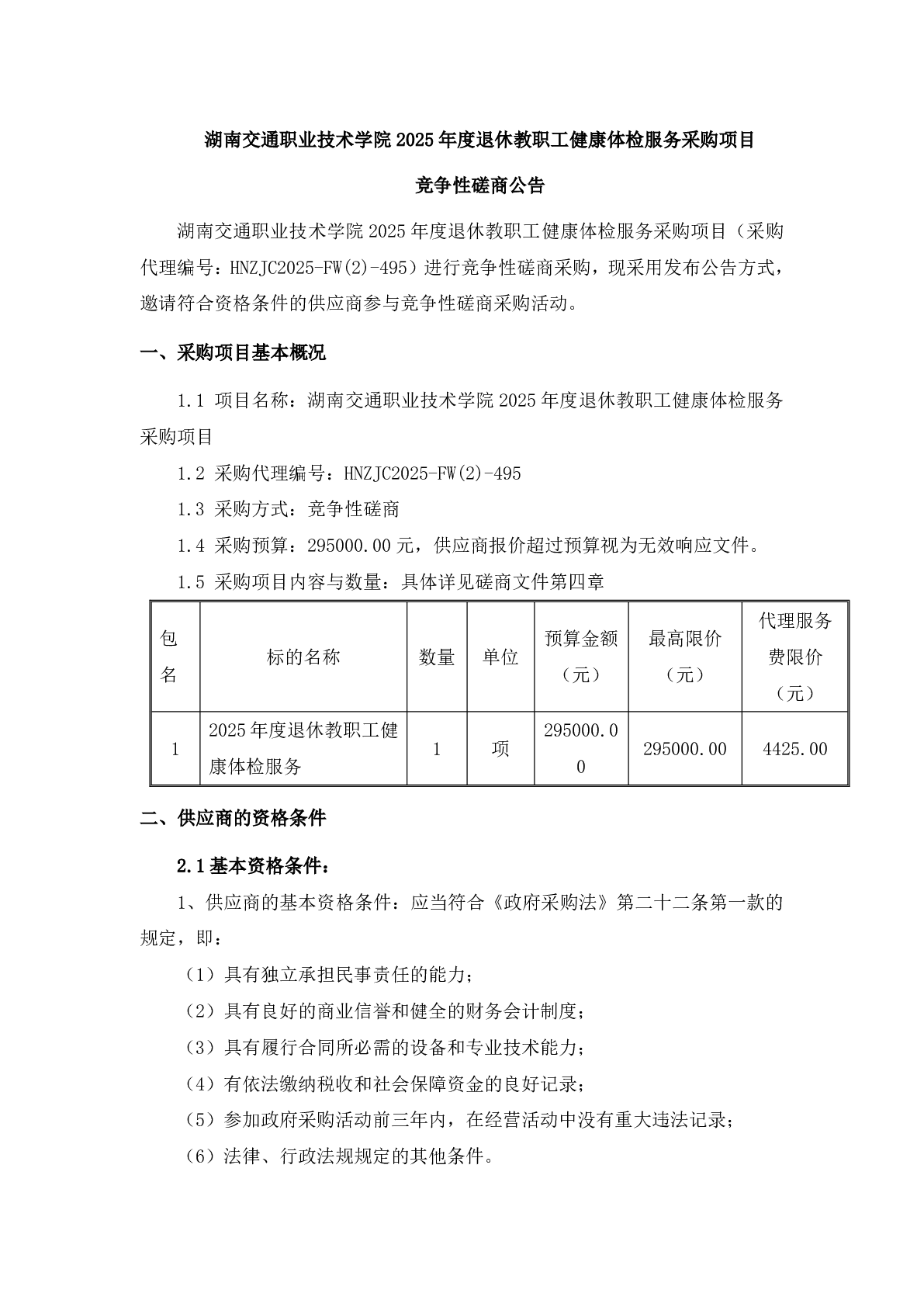 湖南交通职业技术学院 2025 年度退休教职工健康体检服务采购项目竞争性磋商公告
