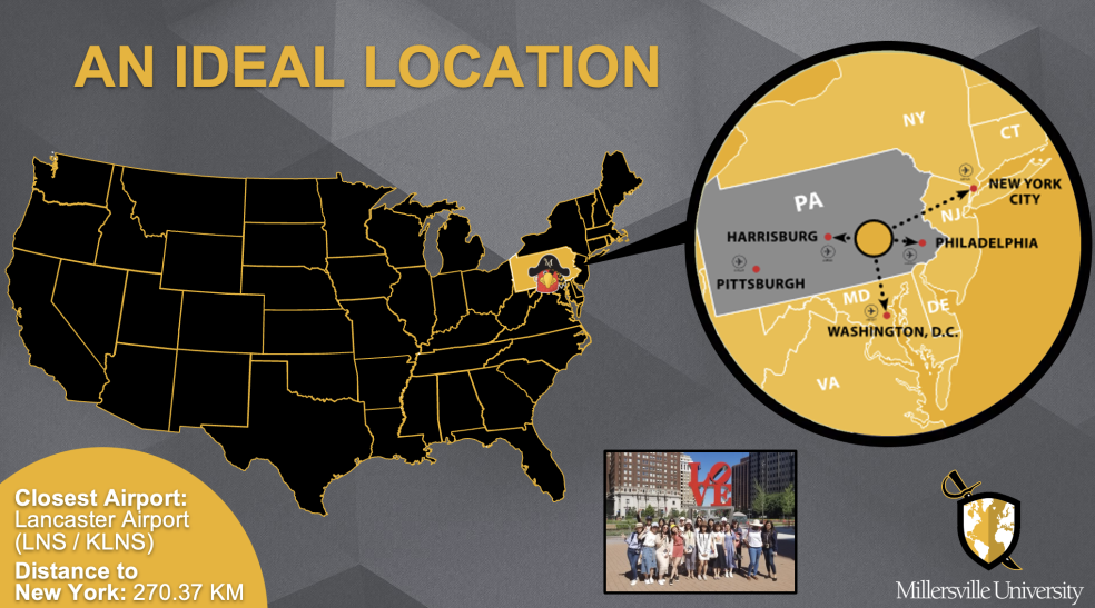 宾夕法尼亚州被称为 “基石之州”,是米勒斯维尔大学的所在地。校园距离历史名城兰开斯特 5 公里,兰开斯特是美国最受欢迎的城市之一。从校园出发去去华盛顿特区、巴尔的摩、费城和纽约市乘汽车或火车只需两小时。