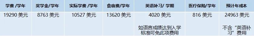 2)留学期间美方院校费用:按美方大学当年官网公布费用标准收费(2024年收费约人民币20万/学年,仅做参考)。