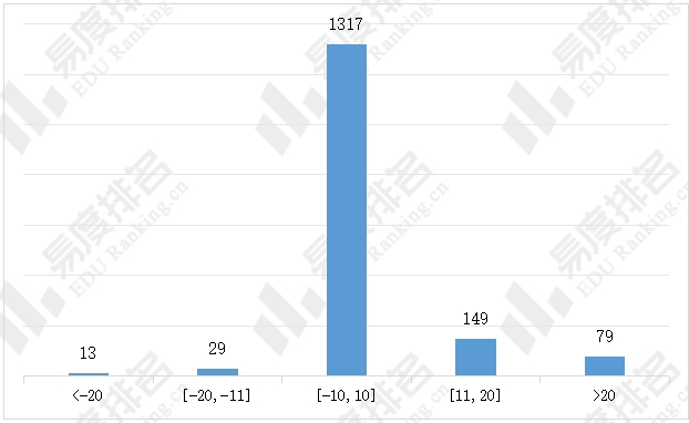下图展示了湖南2025年历史类普通本科批院校-专业组投档最低分与上一年度同位分差值的直方图,差值为负代表院校-专业组2025年的投档位次有所下降,反之则代表院校-专业组的投档位次有所上升。