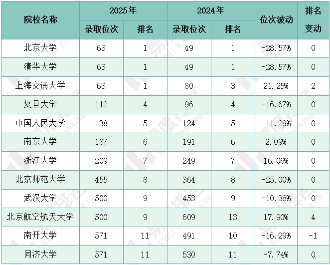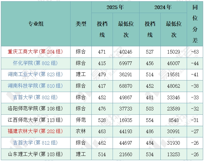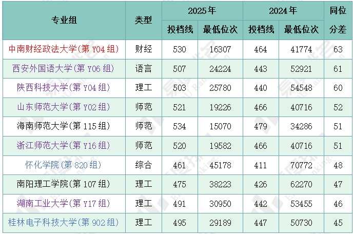 注:1.2024年同位分=2024年投档位次在2025年一分一段表中所对应的分数;2.仅含两年均招生的专业组