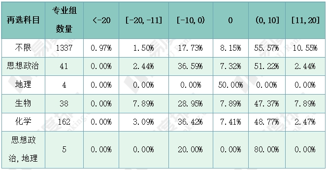 下表展示了湖南院校-专业组各选科的同位分差分布情况。各专业组再选科目以不限或