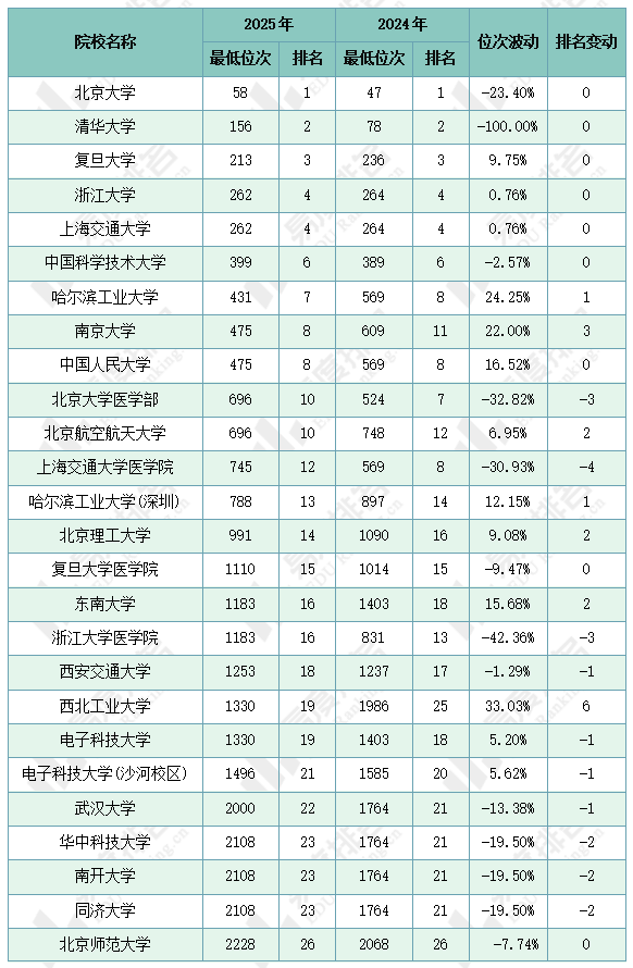 表4 2024-2025年985院校投档位次波动(物理本科)