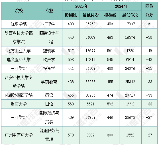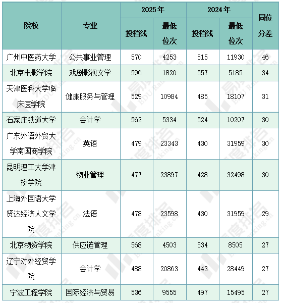 注:1.2024年同位分=2024年投档位次在2025年一分一段表中所对应的分数;2.仅含两年均招生的专业
