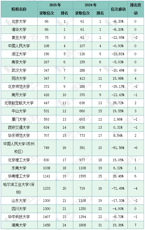 表4 2024-2025年985院校投档位次波动(历史本科)