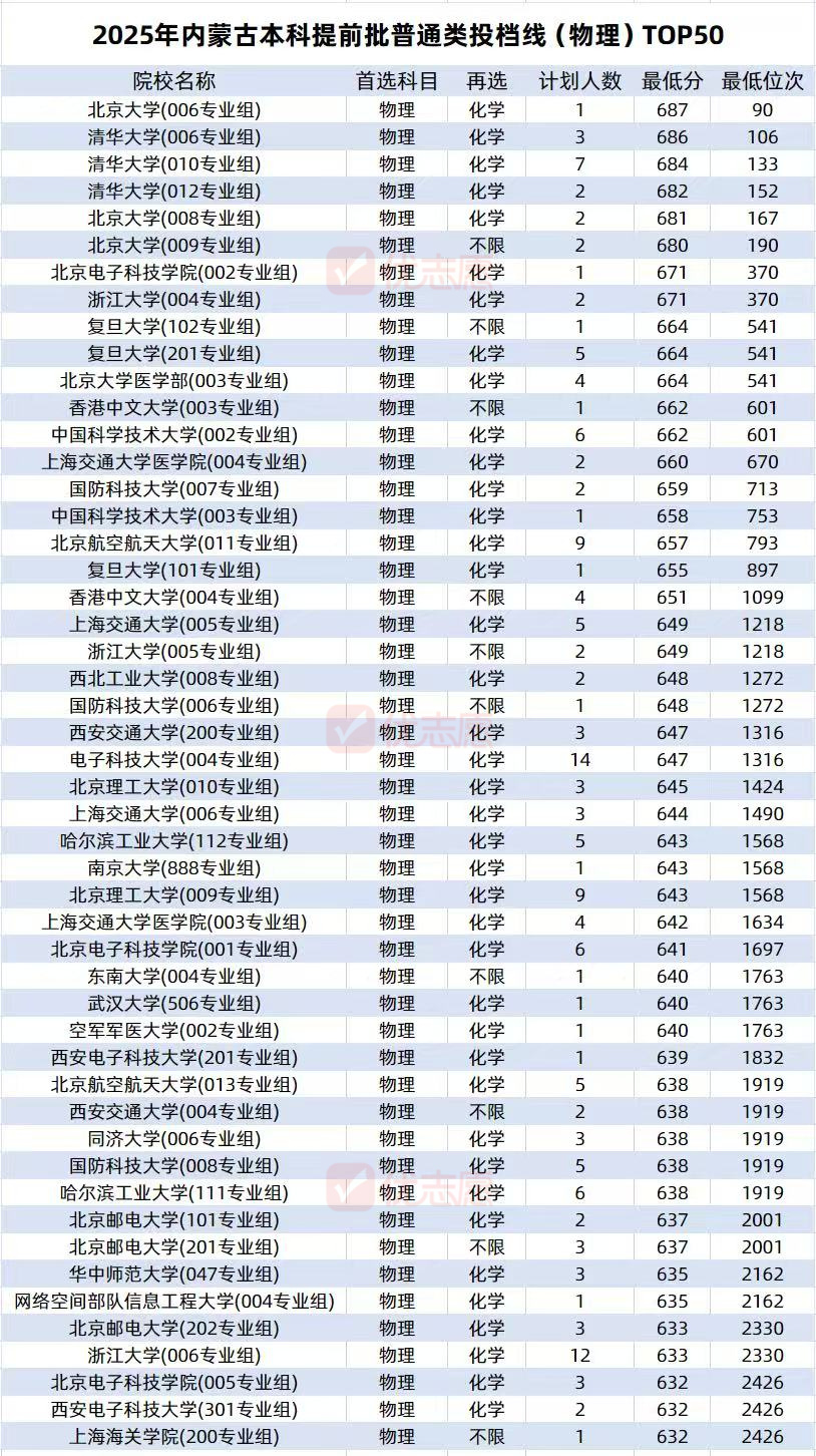 2025年内蒙古提前批分数线(物理)榜单上,西北工业大学008组航空航天类(航宇力学)高校专项计划首次进入本科提前批以648分的最低分跻身前三十,位列第二十二,竞争优势显著。