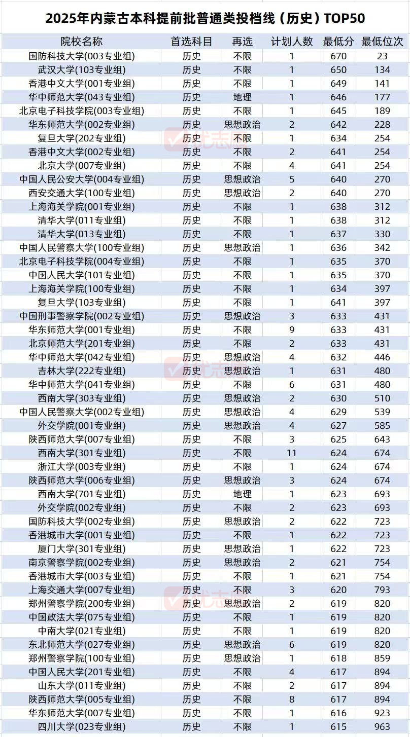 在2025年内蒙古本科提前批普通线投档线(历史)TOP50榜单中,陕西师范大学表现突出:(07)组英语、(06)组思想政治教育、(05)组特殊教育及汉语言文学、历史学排名均大幅上升,其中特殊教育专业首次进入提前批便迅速崭露头角。