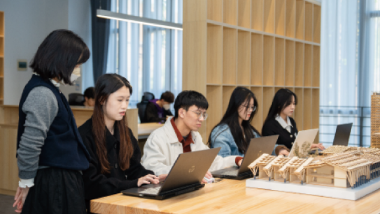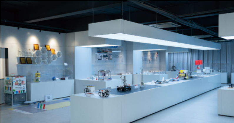 建筑设计创作坊是集学科竞赛、建筑设计与工程实践的基地,由展示厅和创作室组成,以师徒制、项目式教学延伸课程。
