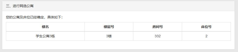 注意:公寓及床位选择成功后将不能进行修改,以学生公寓 3栋 332房间 2号床位为例,选择后再次点击左侧“网选公寓”时界面会显示出当前您所选择的床位,而不是出现之前让您选择房间及床位的界面,如下图所示。